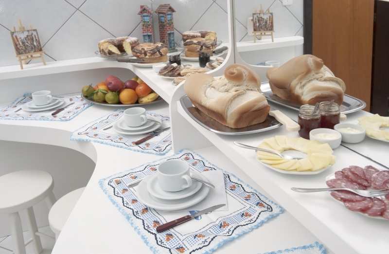 Café da manhã tipicamente colonial, incluindo pão colonial, queijos, embutidos, cucas, bolos, grostoli, biscoitos, geleias caseiras (uva, figo e pêssego), nata, café, leite, sucos e frutas da época.